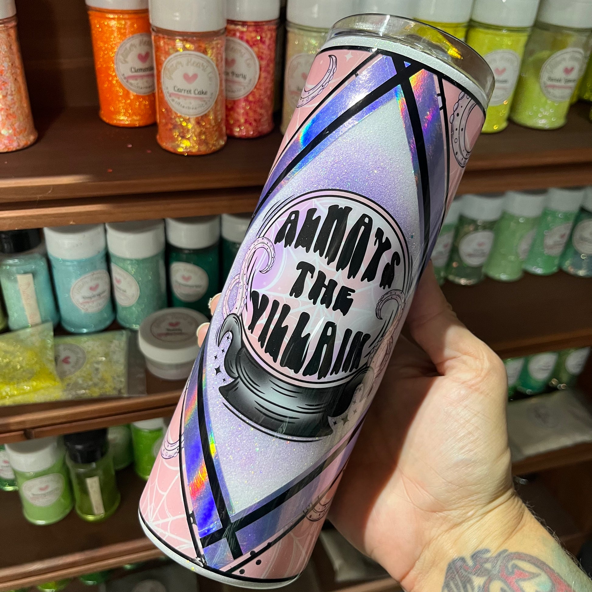 Always the Villain decal with coordinating vinyl, and a burst of white & lavender glitters.