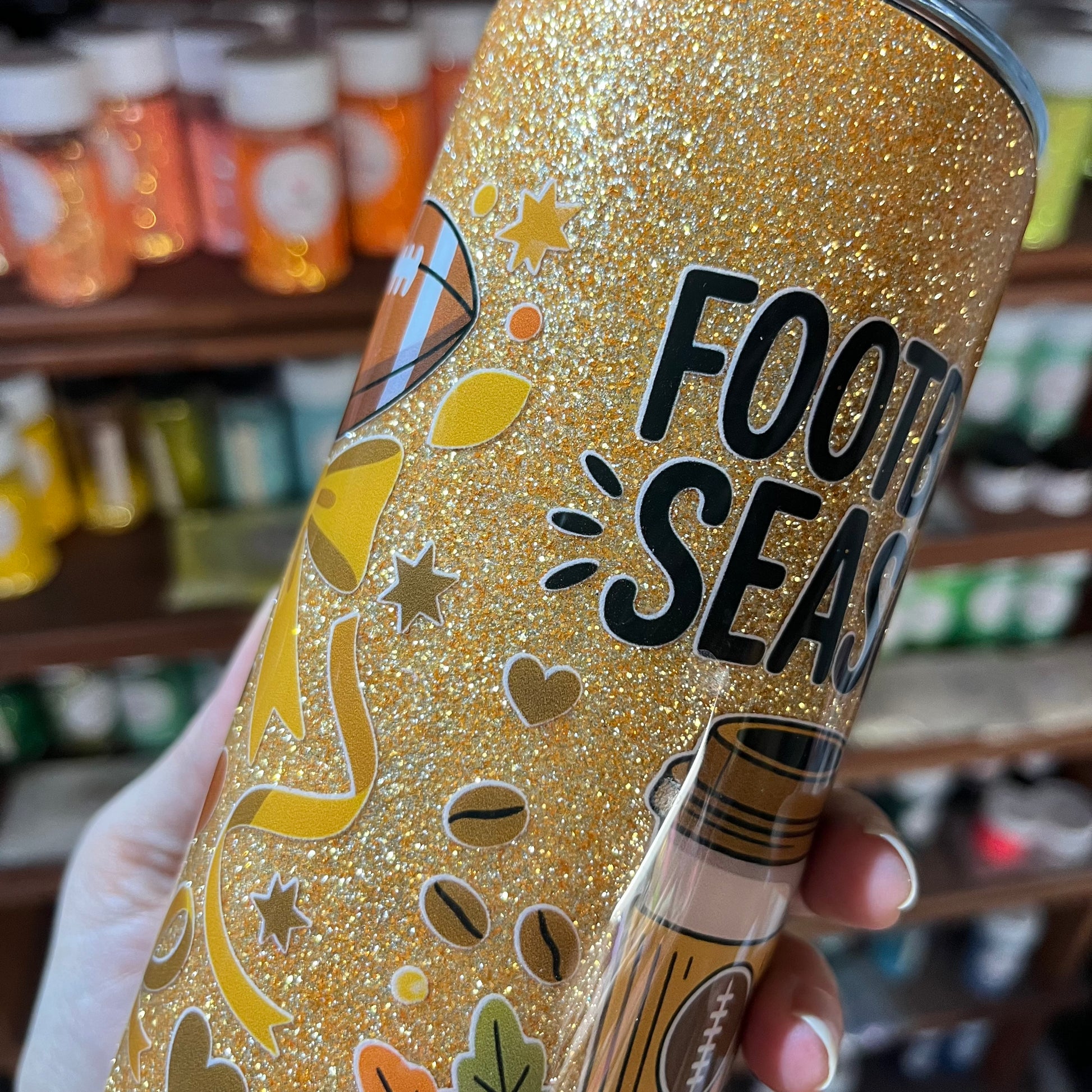 Wrapped in a sparkling gold glitter finish and topped with cozy fall-football graphics, this cup brings all the autumn vibes straight to your drink.