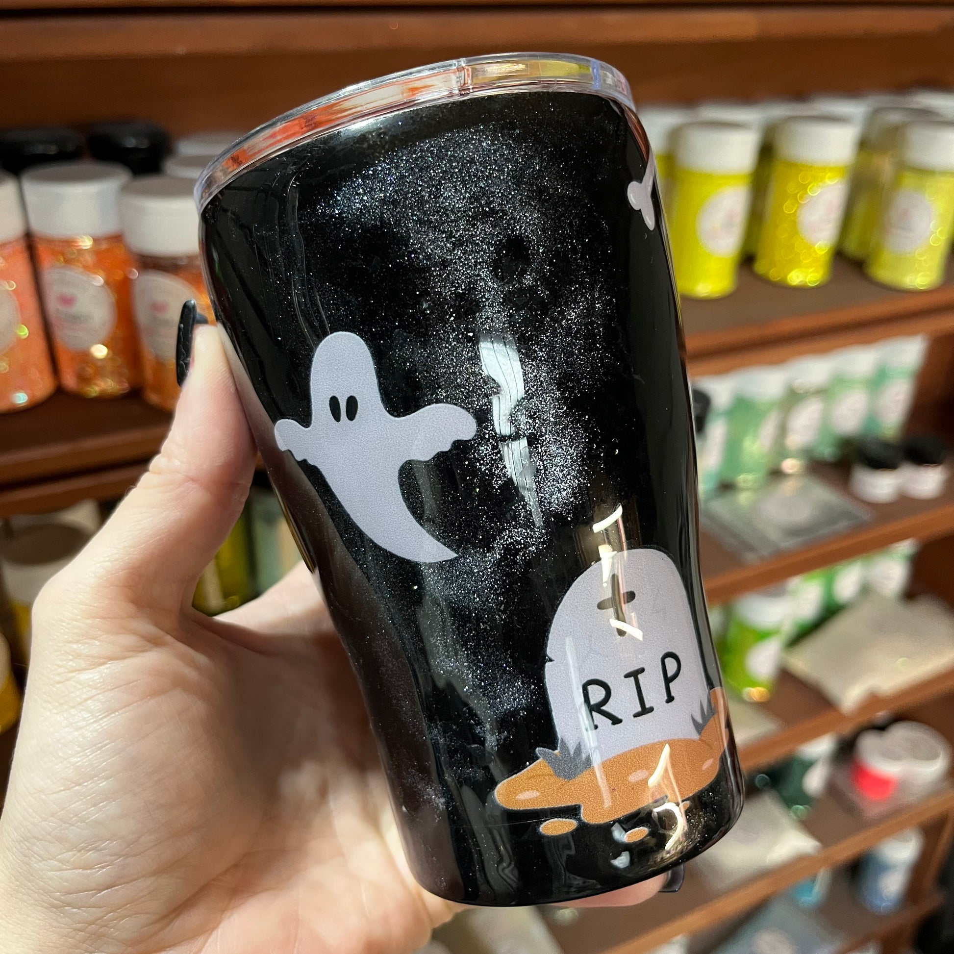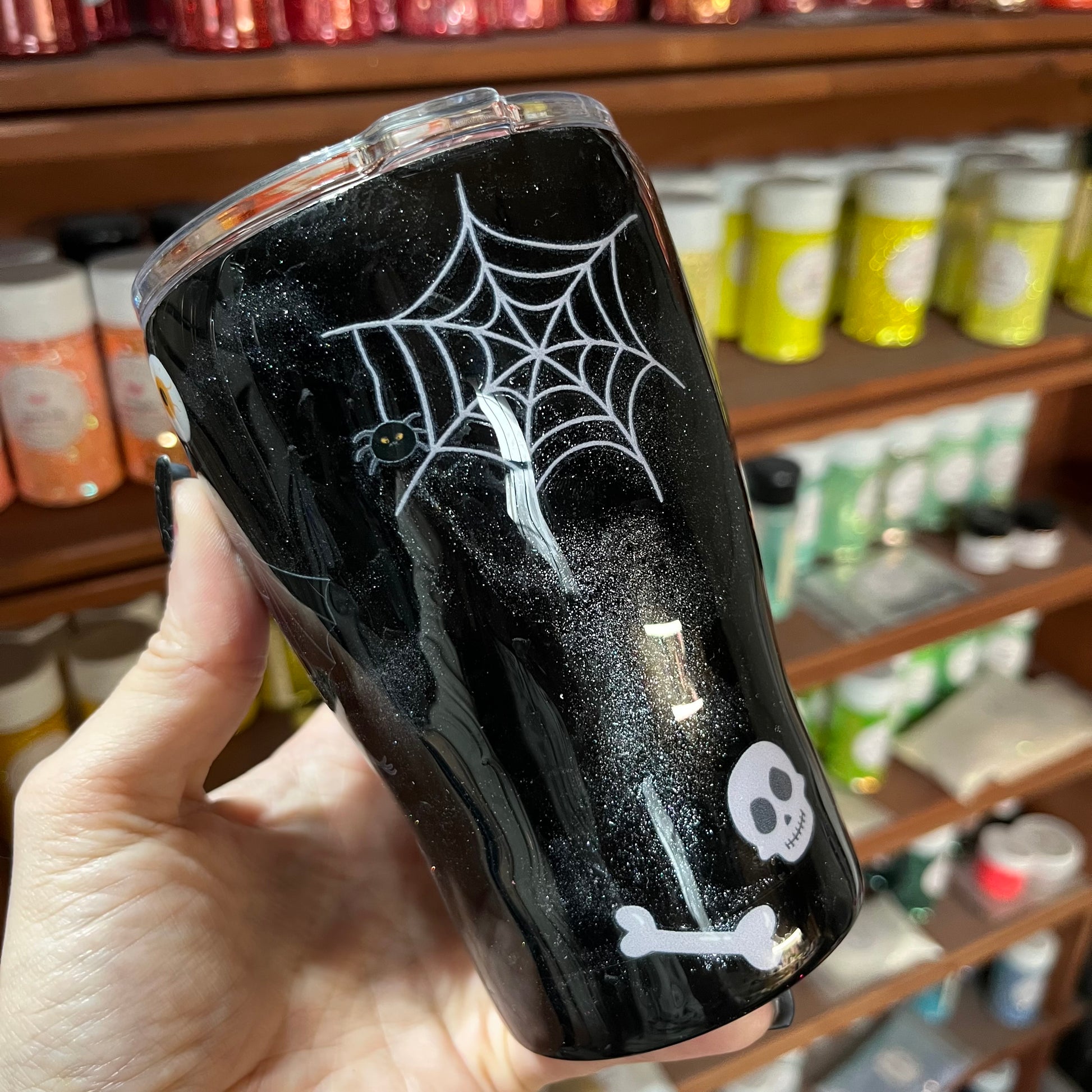 A spooky-cute tumbler made just for little hands. This 12oz kids curve features a glossy black glitter base with friendly ghosts, bats, spiderwebs, and playful Halloween icons—perfectly spooky without being scary.