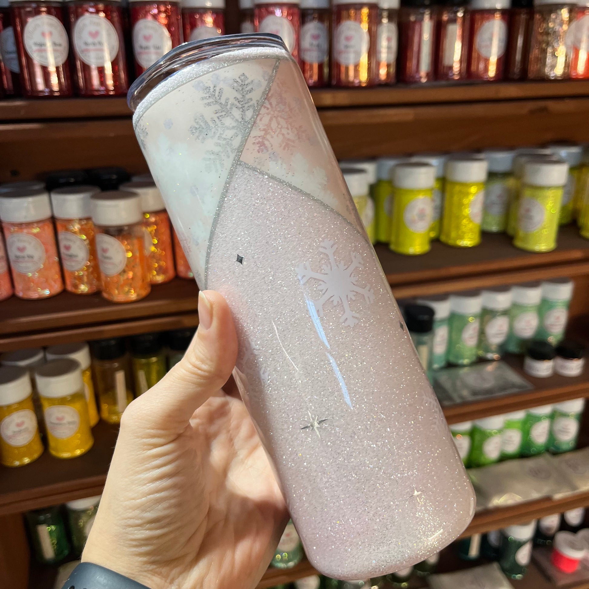 Soft, frosty, and full of sparkle — this 20oz stainless steel tumbler features a pink-to-white winter blend with silver and white snowflakes. Finished with a smooth, glossy glitter coat for the perfect subtle shimmer.