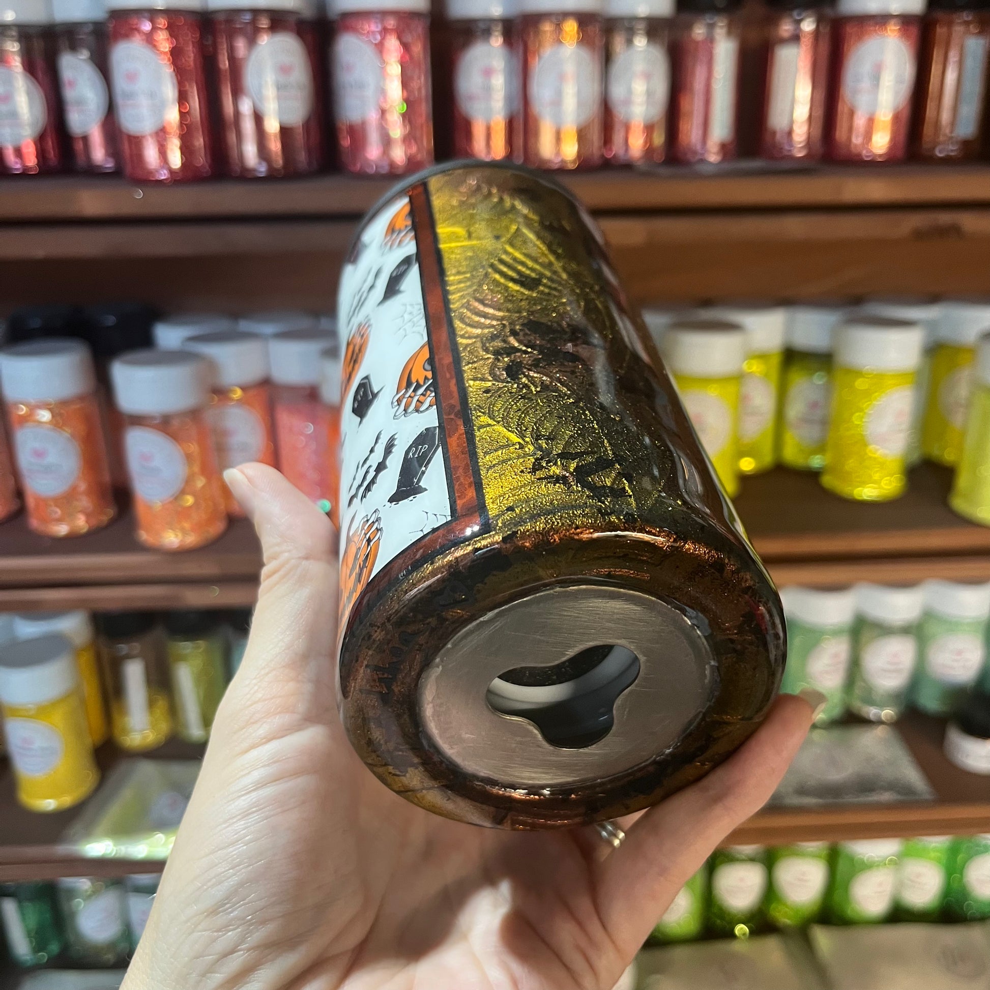 Rust orange to golden yellow color shift over creepy webs, with RIP pumpkin vinyl on opposite side.