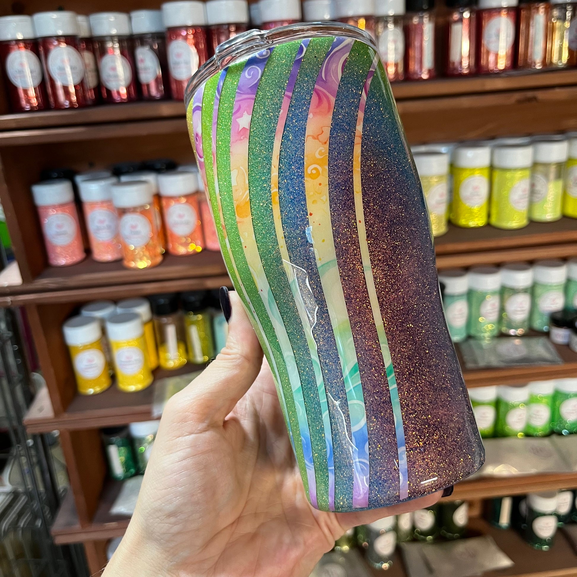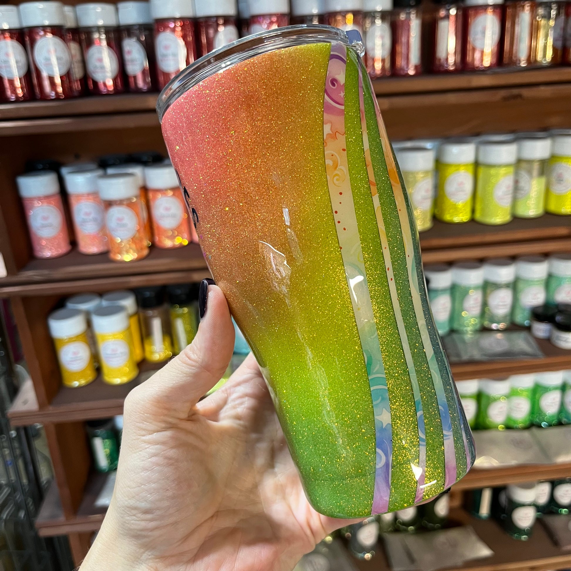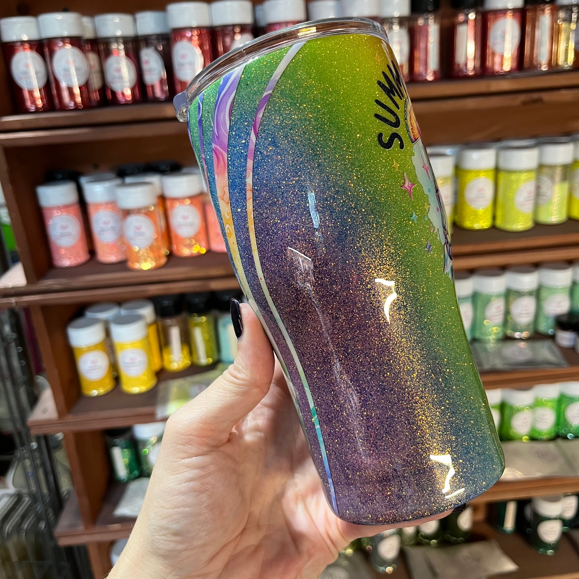 Rainbow glitters at an angle with swirls of rainbow striped vinyl, topped off with a Summer Vibes skellie decal.