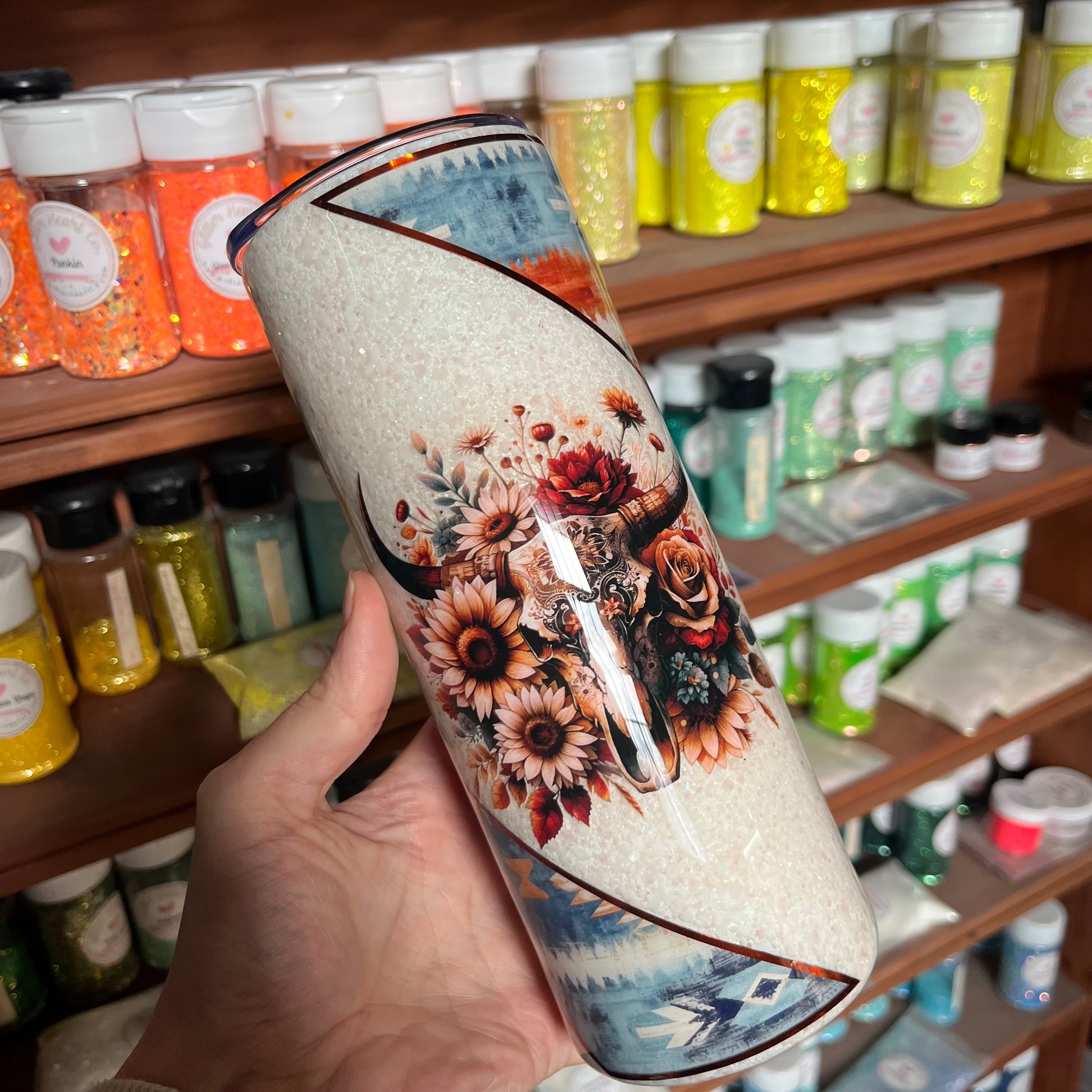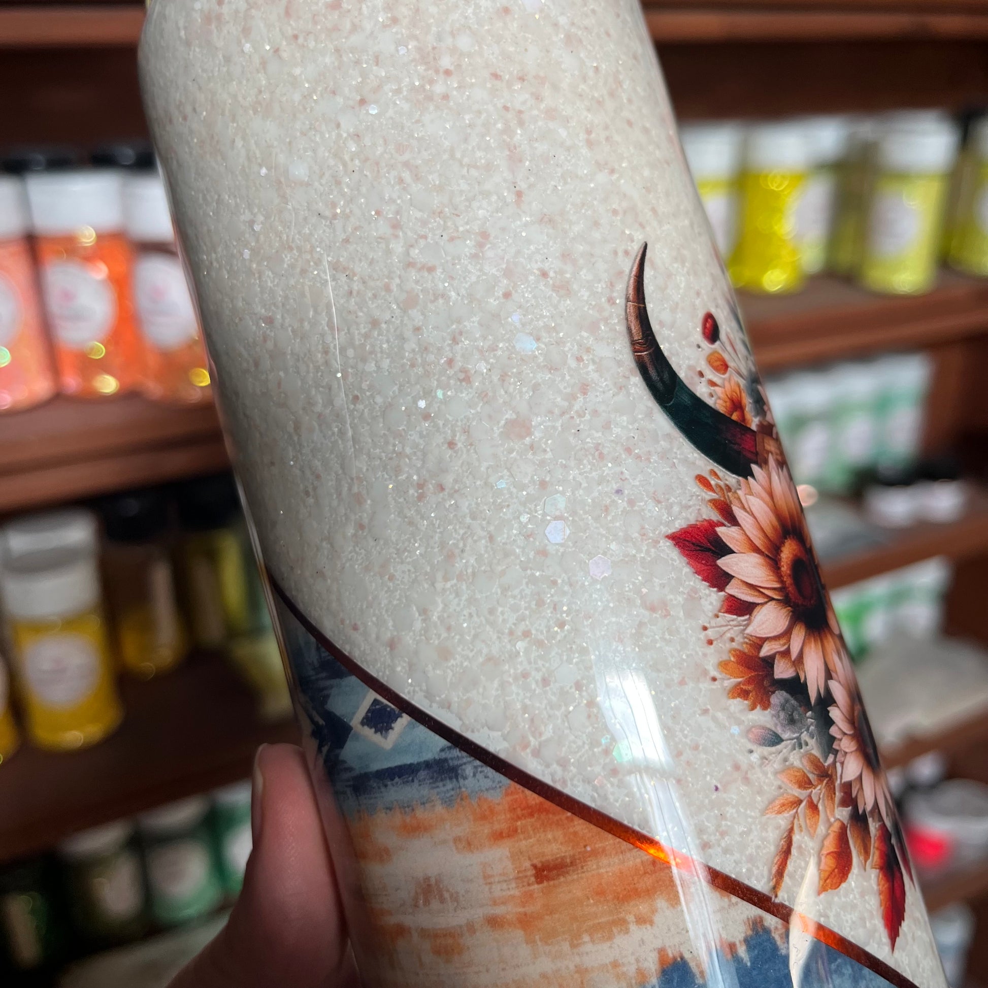 This 20oz straight is giving full “sunset over the prairie” vibes — rich florals, warm tones, and that soft Magnolia shimmer that makes the whole cup glow. The blend of western patterns and floral skull detailing is chef’s kiss for anyone who loves a rustic aesthetic with a little glamour mixed in. 🤠💐✨
